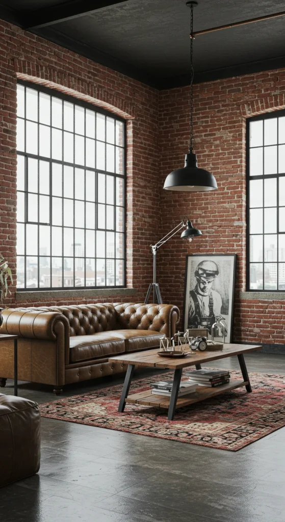 Leather furniture introduces warmth and durability to industrial interiors.