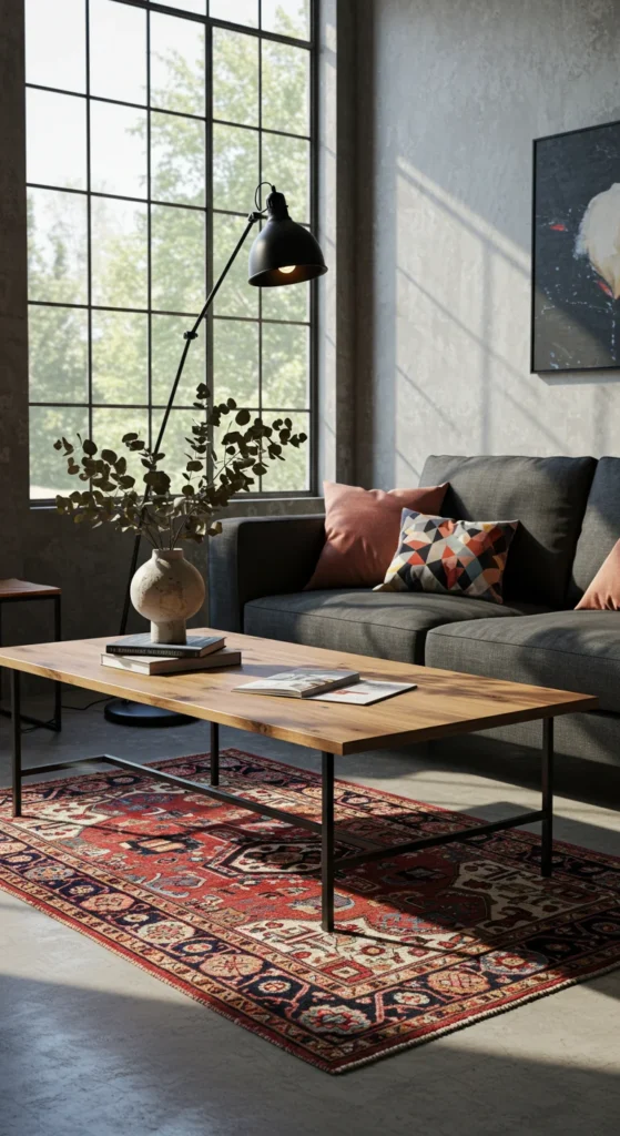 Rugs soften industrial interiors while adding texture.