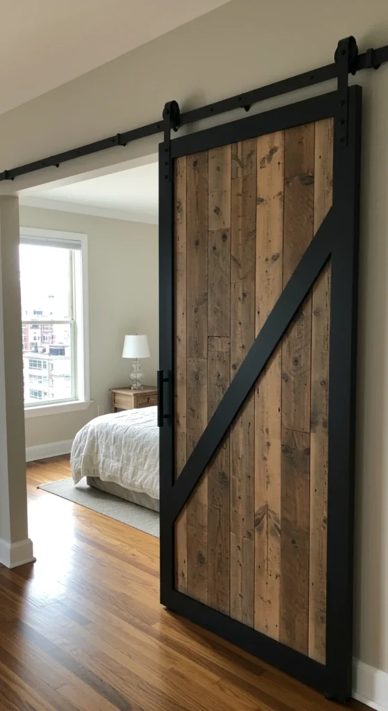 Kits for DIY barn doors are widely available and can be customized with reclaimed wood for a rustic finish.