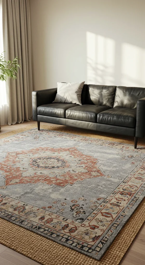 Layering rugs—such as a patterned rug over a jute base—creates dimension and anchors furniture arrangements.