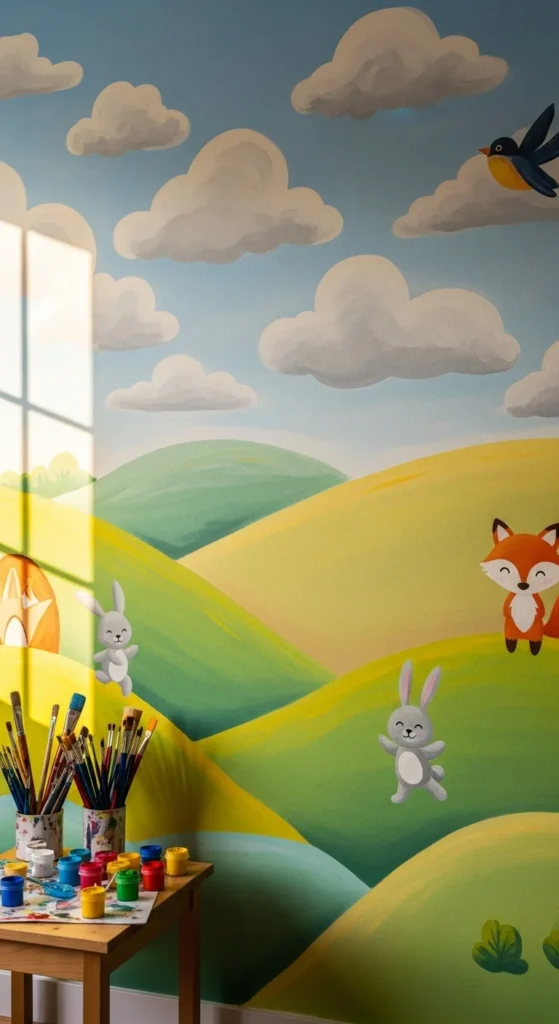 A hand-painted mural instantly changes a plain wall into something kids get excited about. You don’t need artistic training. Simple shapes like mountains, stars, or large animals work great. Use soft, child-safe paints and choose two or three main colors. This keeps the wall clear instead of chaotic. Add tape lines to guide your shapes and create clean edges. You can also let kids paint small sections so they feel part of the design. If painting feels too big, use removable paint markers for outlines and fill in with simple brushes. A mural makes the room feel custom without spending much. Choose a theme your child enjoys—space, forests, underwater scenes, or rainbows—and keep the artwork bold and clear. Finish with a protective matte coat so the wall stays clean.