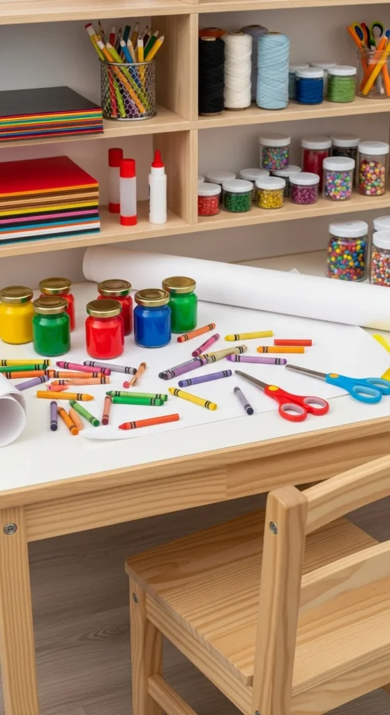 A craft table gives kids a place to draw, paint, and create daily projects. Choose a small table with a wipeable surface. Add small containers for markers, glue, and colored paper. Use wall-mounted bins to keep supplies within reach but off the table. This helps kids keep the area tidy. You can also attach a paper roll on one side so kids can pull out sheets easily. Keep a small trash bin nearby for quick cleanup. A craft table encourages creativity all day without making the rest of the room messy.