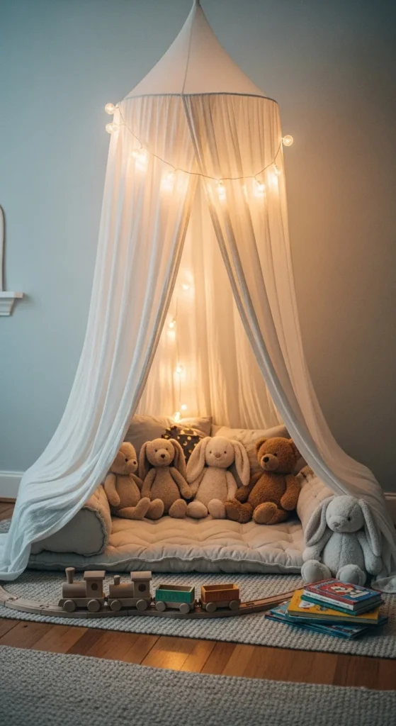 A canopy brings adventure into a bedroom. Kids love having a small hideaway to play or read. Choose a lightweight fabric that hangs softly from the ceiling. Place a floor cushion or beanbag underneath to make it cozy. Add string lights or small lanterns for a warm glow. Keep the area simple so it stays relaxing. A canopy works well over a bed or in a quiet corner. It’s affordable and easy to take down or move later. Kids enjoy having a private spot that feels magical.