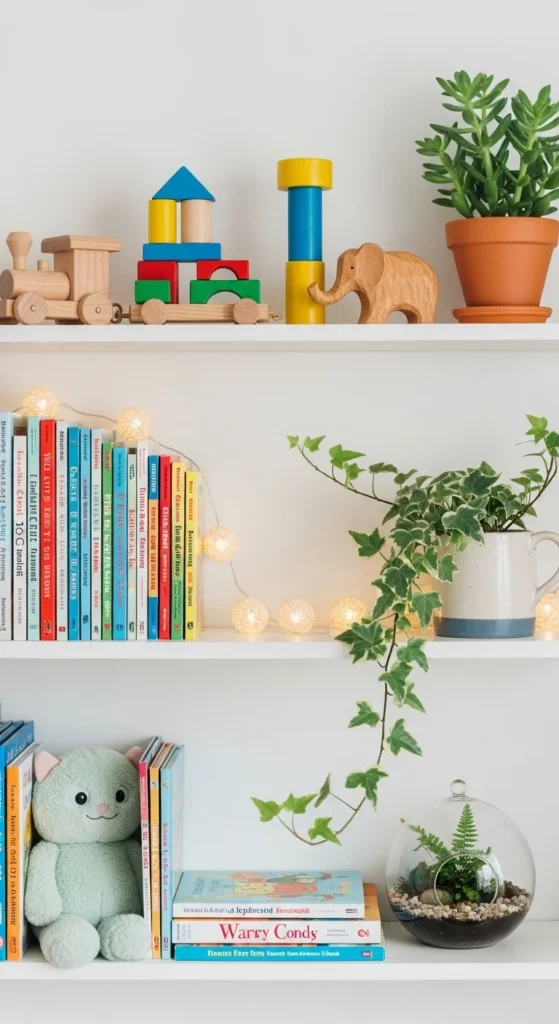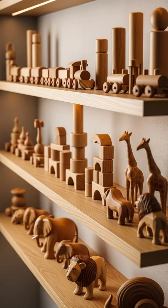 Wooden toys look charming and last longer than plastic ones. Display them on shelves instead of hiding them in bins. Choose a mix of simple shapes and cute animal figures. Keep the colors soft to match the room’s style. These toys double as decor and play items. Rotate them every few weeks to keep kids interested. Add a few woven baskets nearby for larger toys. Wooden toys create a warm feeling and help the room stay visually calm.