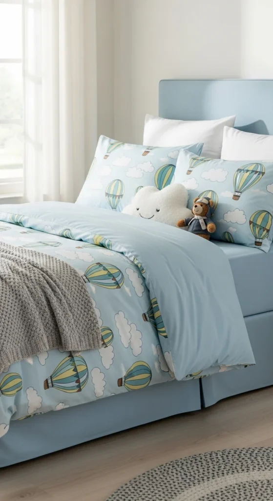 Themed bedding brings the whole room together. Choose a pattern your child enjoys—animals, outer space, flowers, or cars. Keep the rest of the room simple so the bedding stands out. Washable fabric is important since spills happen often. Add two or three matching pillows for comfort. Avoid overly busy patterns so the bed stays the calm center of the room. Change the bedding seasonally to make the room feel new.