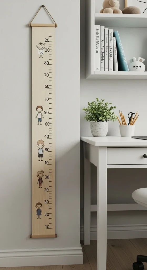 A growth chart is a fun way to track height changes. Hang it at the correct starting height so measurements stay accurate. Choose a wooden ruler style or a simple fabric version. Kids enjoy marking their height regularly. Keep the chart near a low-traffic wall so it doesn’t get bumped. Add small stickers or dates beside each mark. This becomes a sweet memory piece that parents can keep as kids grow older.