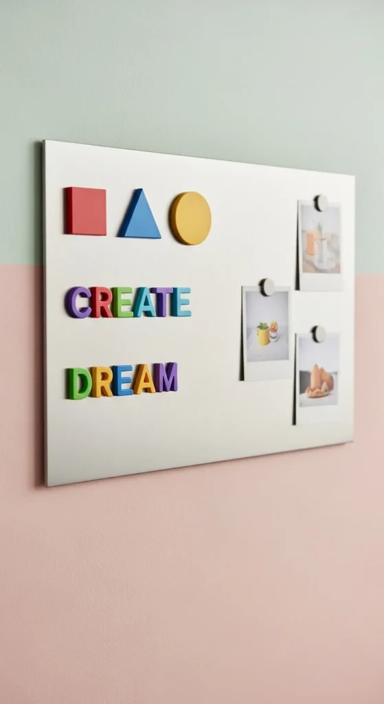 A magnetic board adds both play and organization. Kids can arrange letters, shapes, or small photos. Choose a board with rounded edges for safety. Install it at a height kids can easily reach. Add colorful magnets but keep the quantity balanced so the board doesn’t feel cluttered. Use it for daily activities like spelling games or picture matching. A magnetic board also works well above a craft table. It’s easy to clean and replace magnets anytime.