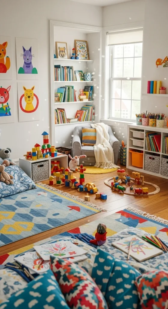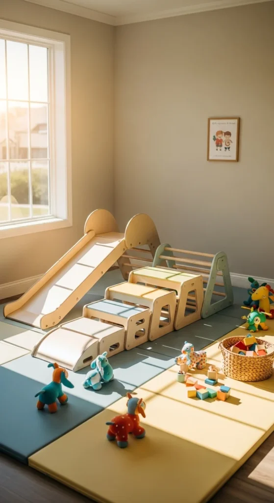 A small indoor playground corner gives kids energy and excitement indoors. Use soft mats to keep the floor safe. Add small climbing blocks, a mini slide, or soft balance beams. Choose lightweight materials so you can move items easily. This corner helps kids stay active even on rainy days. Keep toys simple to avoid overstimulation. Rotate the play items every few weeks to keep things interesting. A playground corner works well in shared rooms too.