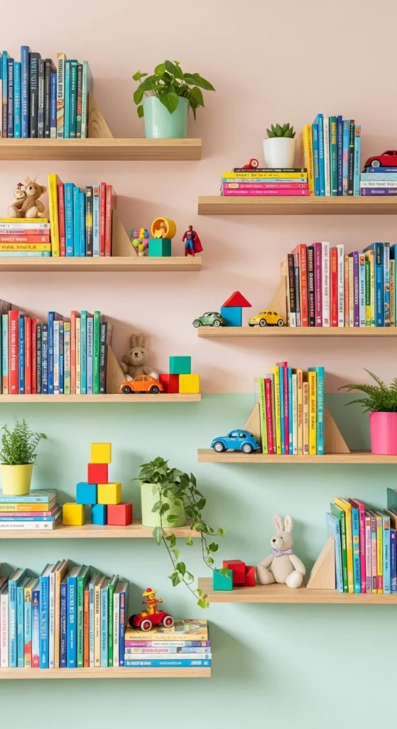 Floating shelves help organize toys and books while adding color to the room. Choose sturdy shelves with rounded edges for safety. Arrange them at varying heights so kids can reach their favorite items easily. Add a mix of books, soft toys, and a few decorative items like framed photos or small wooden figures. Keep the shelves neat so the wall doesn’t feel heavy. You can also use bold shelf brackets to add character without painting the wall. If space allows, create a simple shelf wall that encourages kids to tidy up on their own. This keeps the room cleaner and makes toys feel part of the decor.