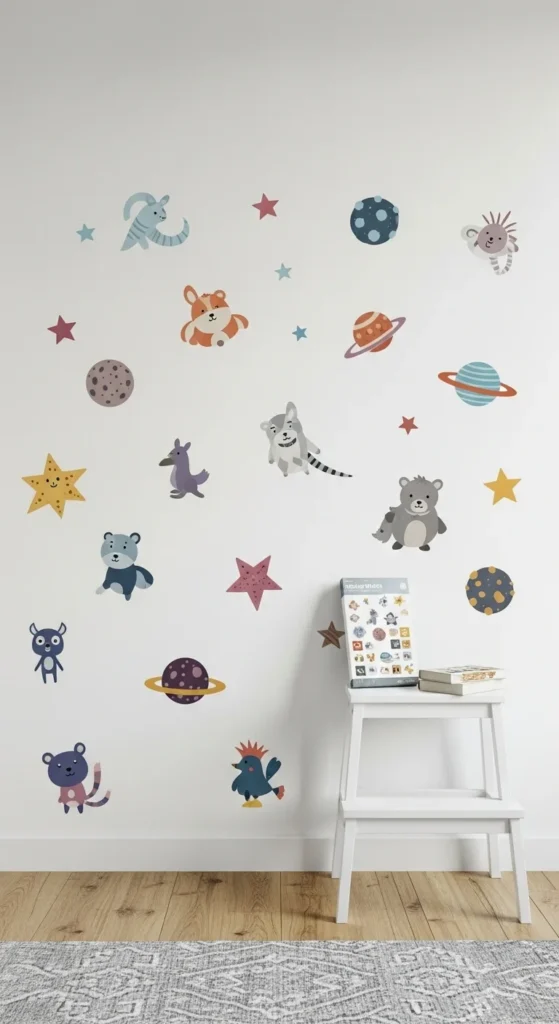 Peel-and-stick decals are great for decorating without commitment. They work well for rented homes or rooms that change quickly as kids grow. Choose decals with simple shapes—stars, hearts, cars, or clouds—so the wall stays calm instead of crowded. Kids can help stick them on, making it a fun activity. These decals come off easily without damaging paint. Add them above the bed, around a reading corner, or across a plain door. If your child loves a theme, like dinosaurs or space, decals make it easy to create a matching look without painting. They’re affordable and can be replaced anytime.