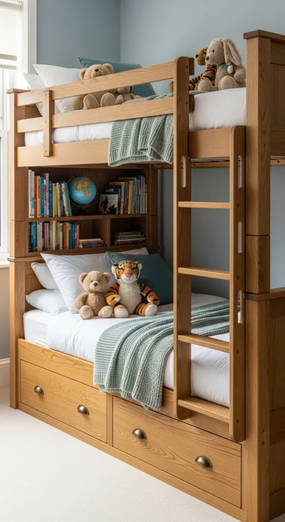 A bunk bed saves space and adds fun for siblings or sleepovers. Choose one with built-in drawers or shelves to keep toys and clothes off the floor. Add soft lighting underneath for older kids who enjoy reading at night. If the bed has a lower section, create a small play zone underneath with pillows and string lights. Use neutral bedding and let kids choose their favorite pillowcases or blankets. This keeps the bed tidy while giving them freedom to personalize. Always secure the ladder and check the bed’s height to match your child’s age.