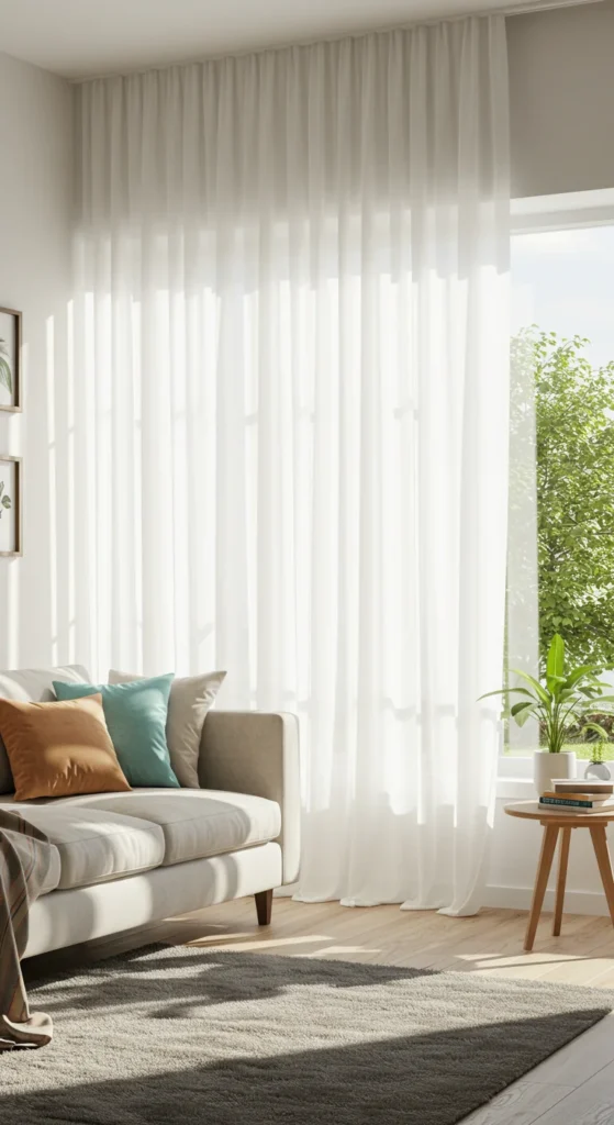 Sheer curtains let natural light filter through while adding softness to your space. They’re affordable and make the room feel bright and open. If privacy is a concern, layer them with blackout curtains you can pull at night. White is timeless, but soft beige or gray works too. Even basic curtains can look expensive if they’re hung high and wide. Guests will instantly notice the breezy, welcoming vibe.