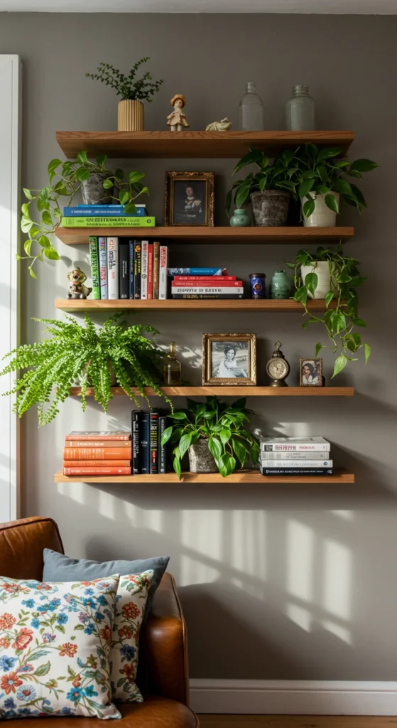 Floating shelves are stylish and practical. Use them to display books, art, or plants without overwhelming the room. They’re easy to install, and budget-friendly versions are available online. Keep décor simple: a mix of vertical and horizontal items with some open space. Change things up seasonally to keep it fresh. Guests will notice how pulled together your living room feels with shelves that show off your personality.