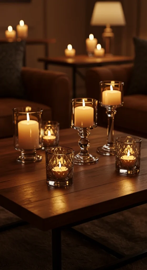 Candles instantly create atmosphere. Place a few on the coffee table, shelves, or even the floor in safe holders. Mix different sizes for variety. If you prefer no flame, battery-operated candles are a great option. You don’t need expensive candles—simple tea lights in glass jars work beautifully. When guests walk in, the glow feels special and welcoming.