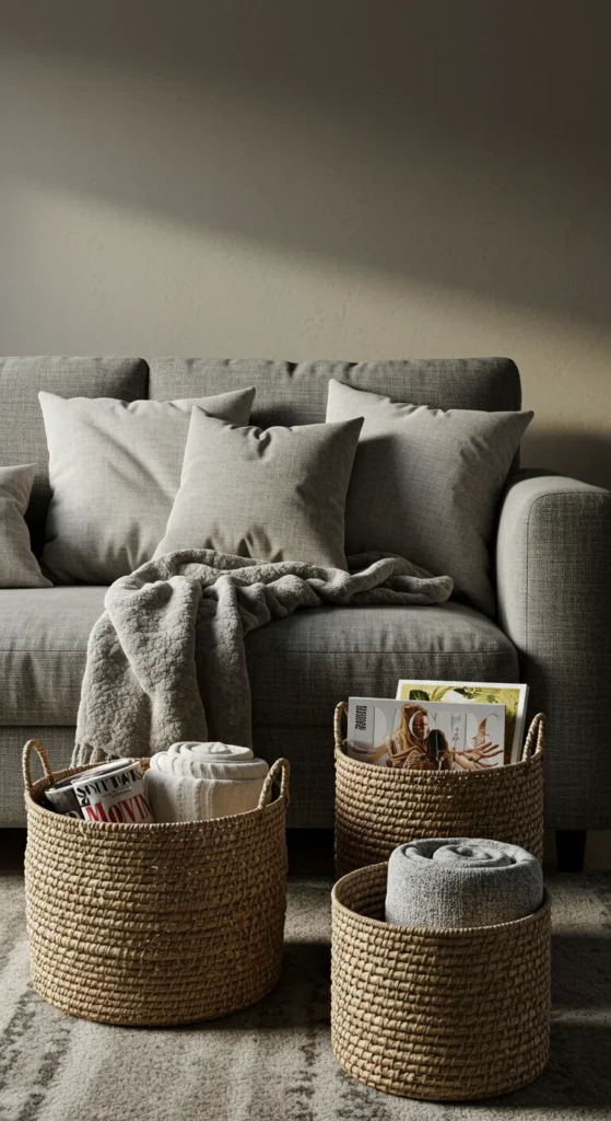 Storage can look stylish too. Open baskets keep clutter under control while adding texture. Use them to hold blankets, toys, or magazines. Woven, wire, or fabric baskets all work depending on your style. You don’t need to buy new—repurpose hampers or crates you already own. Guests notice when a space feels tidy yet cozy, and baskets help achieve both.