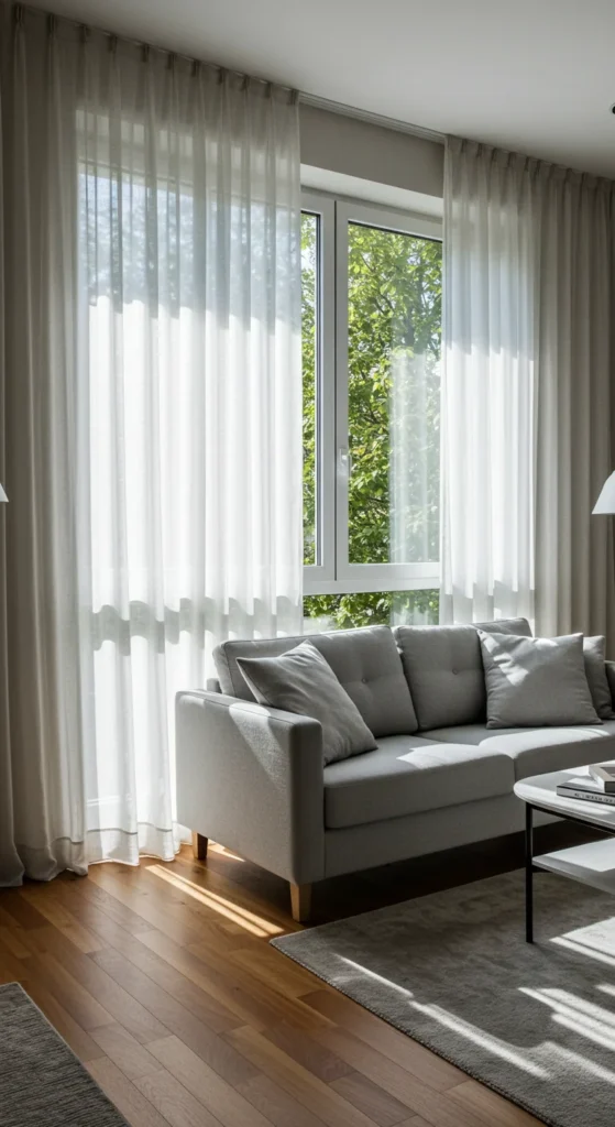 Install sheer curtains or leave them bare if privacy allows. Arrange furniture to avoid blocking windows.