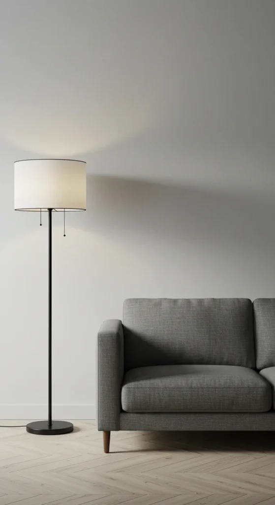 Search thrift shops or online for affordable pendant lights or slim floor lamps. Choose warm-white bulbs to keep the space cozy and not too stark.