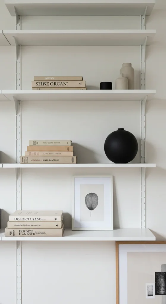 Keep the arrangement simple—two or three shelves with evenly spaced decor like books, a plant, and a framed print.