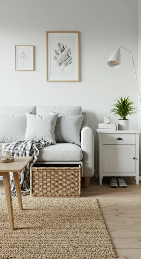 Swap synthetic rugs for natural fiber ones or use woven baskets for storage. Layer a cotton or linen throw on a plain sofa to make the room more inviting.