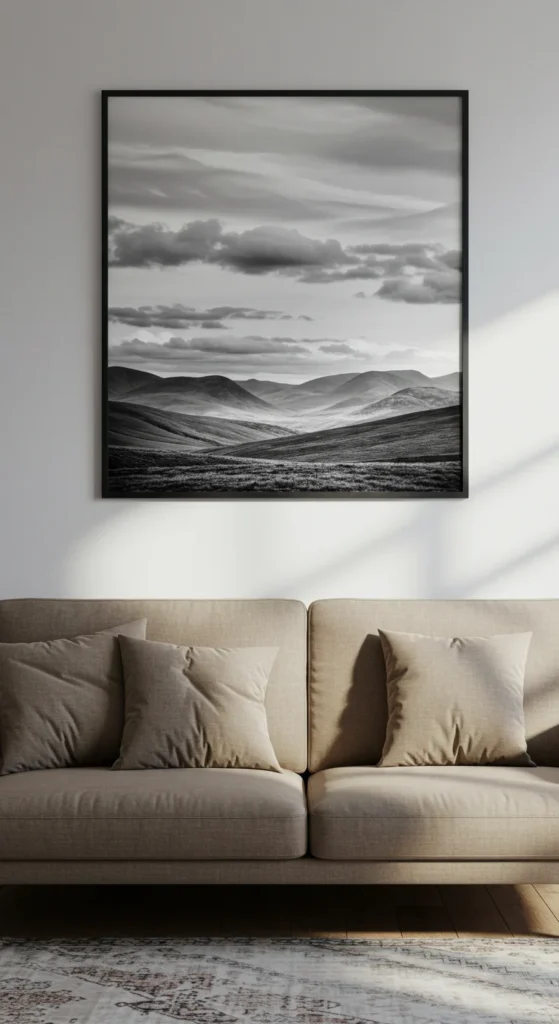 Instead of multiple small artworks, select one large piece for a clean, modern statement. It adds character without creating clutter.