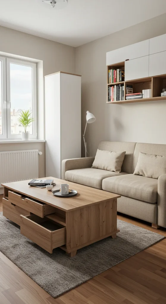 Look for ottomans that store blankets, coffee tables with shelves underneath, or foldable dining tables.