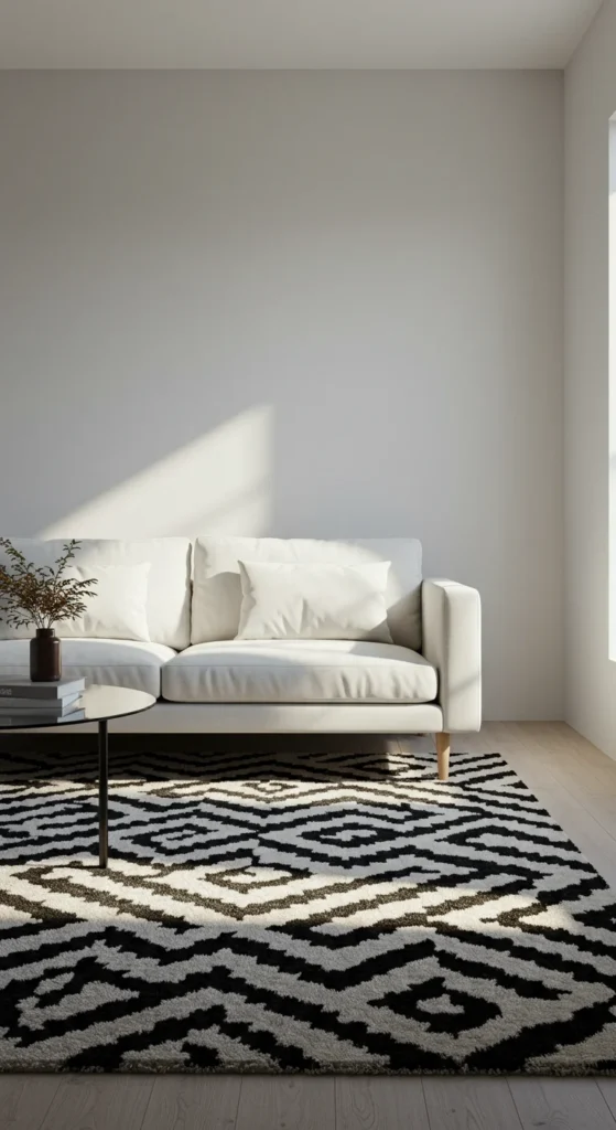 - Select striped or geometric black-and-white rugs to add visual structure.