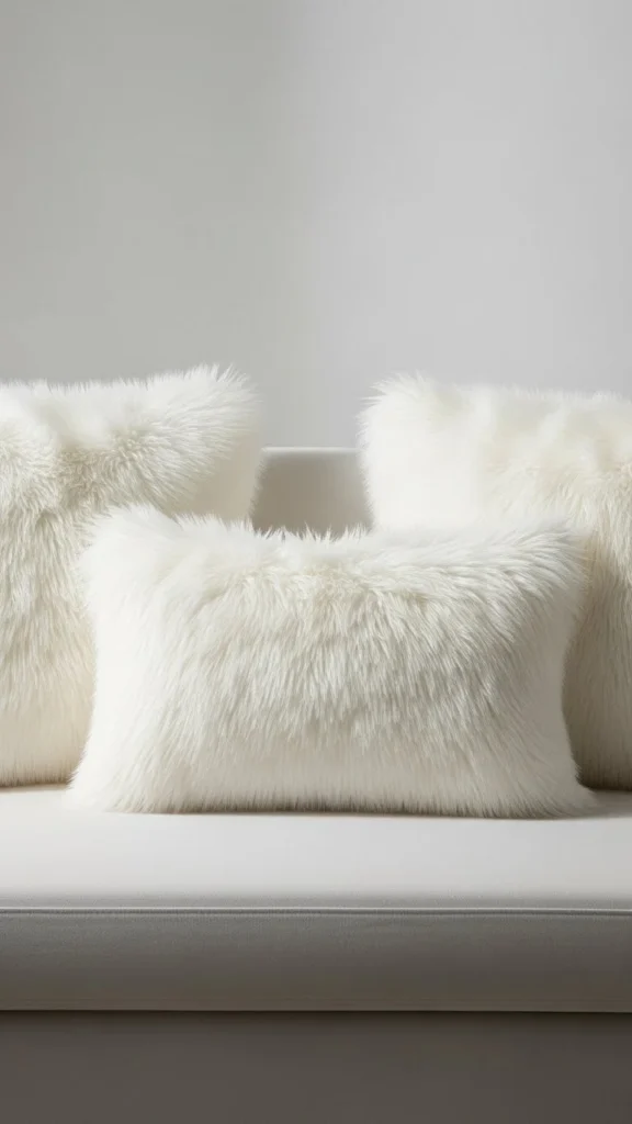 White faux-fur pillows are a classic addition to any space. Their crisp, clean look makes them perfect for minimalist interiors. Pair them with colorful throw blankets for a balanced, cozy look. A DIY alternative is to use white faux-fur fabric to cover an existing pillow for an affordable update.