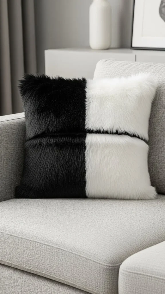 A monochrome faux-fur pillow offers a stylish, minimalist vibe. The black-and-white design is timeless and perfect for modern interiors. You can even customize this style by creating your own two-tone pillow using contrasting faux-fur fabrics.