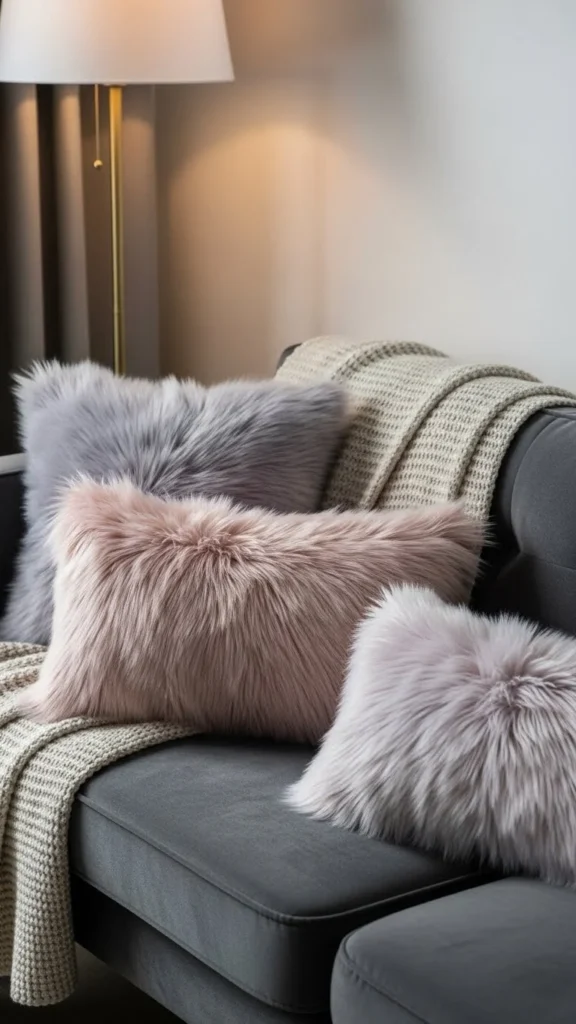 Charcoal gray faux-fur pillows add sophistication and depth to a space. They pair well with light-colored furniture or even other dark tones. A quick DIY tip is to recycle an old pillowcase and cover it with faux-fur fabric. Charcoal also hides dirt and stains well, making it an ideal choice for high-traffic areas.