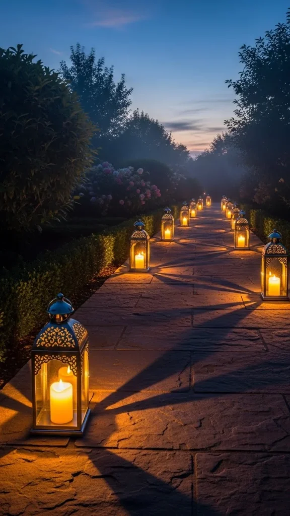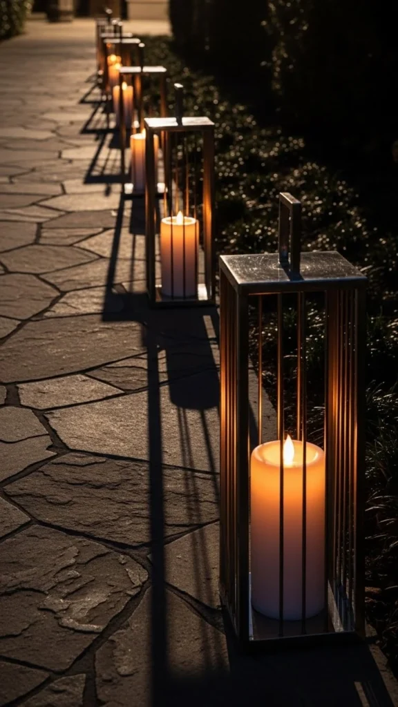 Tall silver lanterns with large LED candles are ideal for creating a dramatic pathway. These lanterns are larger than the typical size, and their height creates a stunning focal point. The oversized candles add extra warmth and light, making your entrance feel grand and inviting. DIY this look by using tall silver lanterns and large LED candles, and place them strategically along your pathway for maximum impact.