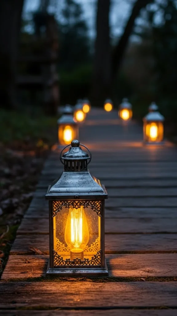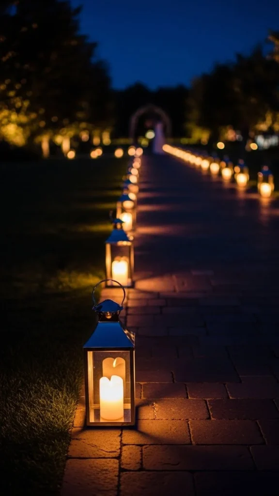 Mini silver lanterns with battery-operated lights are an adorable way to light up your pathway. These small, compact lanterns can be placed along the walkway to guide guests in a charming way. DIY this look by using small silver lanterns and inserting battery-operated lights, such as fairy lights or LED candles, to create a cozy and inviting atmosphere.