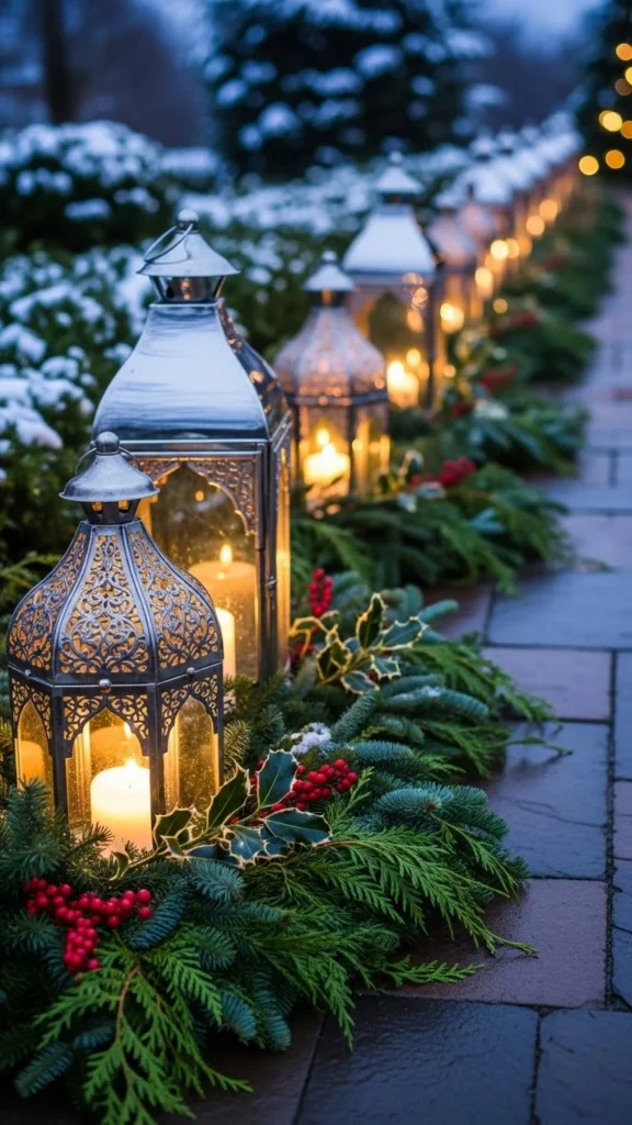 Silver lanterns with frosted glass provide a soft, diffused glow, perfect for a serene and elegant pathway. The frosted glass adds a layer of sophistication, making the light look more inviting and peaceful. To create this effect yourself, purchase silver lanterns with frosted glass panels or apply frosted glass spray to plain lanterns. These lanterns work beautifully in snowy or winter-themed New Year’s décor.