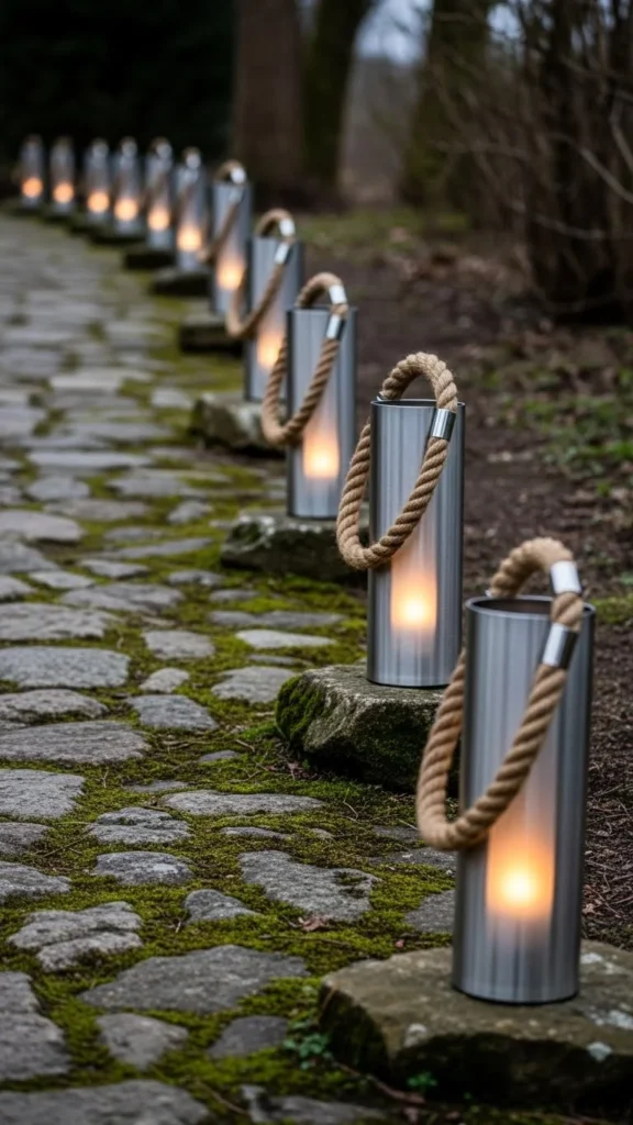 Silver lanterns with twisted rope handles add a rustic, nautical feel to your New Year’s décor. The sturdy rope handles provide a unique contrast to the sleek silver lanterns, making them stand out along the pathway. DIY this look by replacing standard handles with twisted rope for a cozy, handmade touch. These lanterns work well in rustic or beach-themed settings.