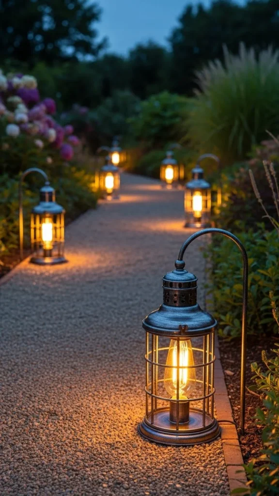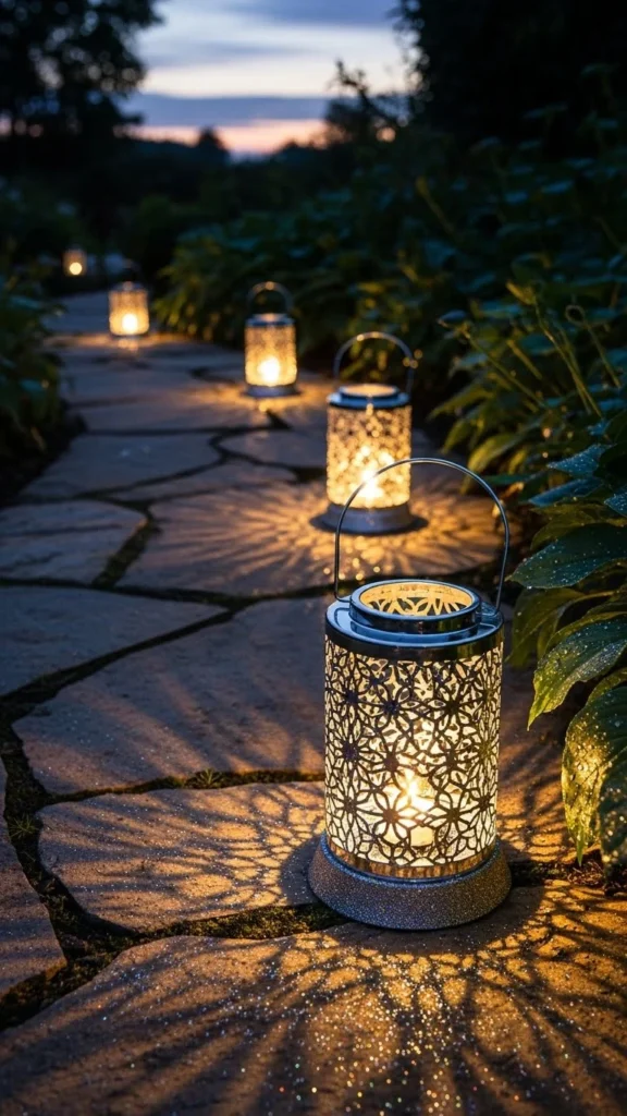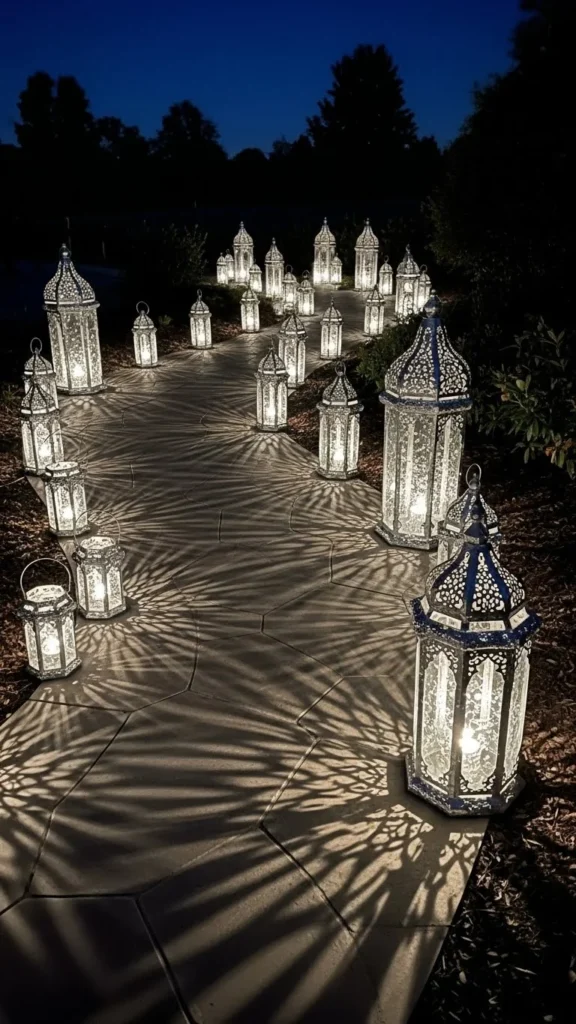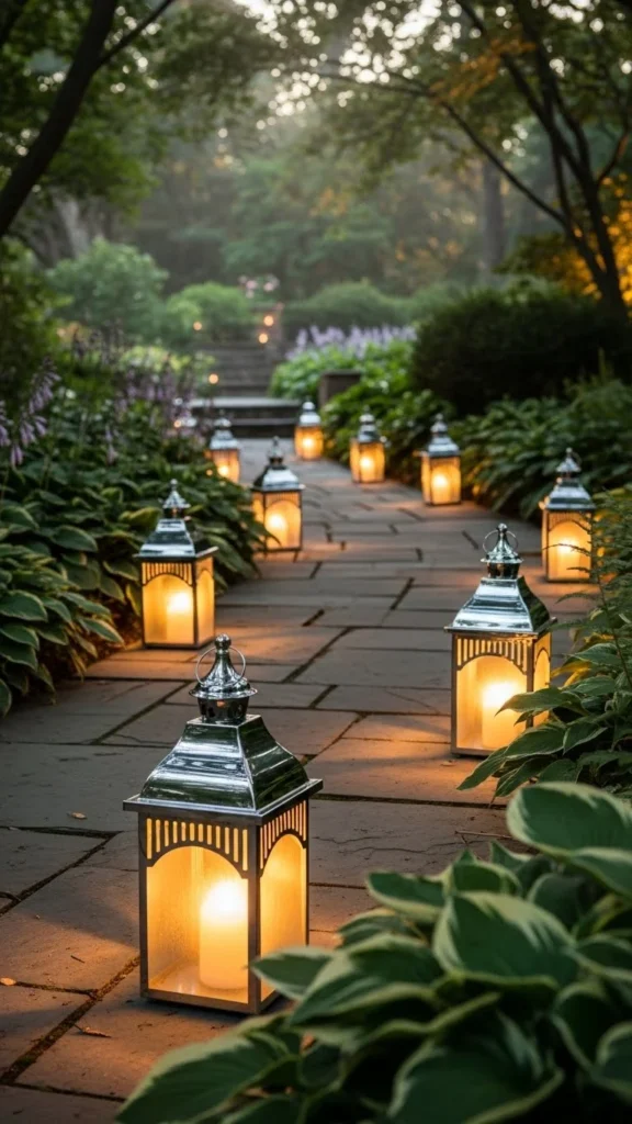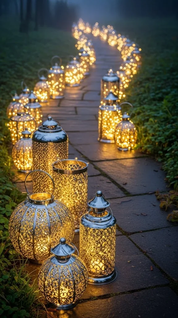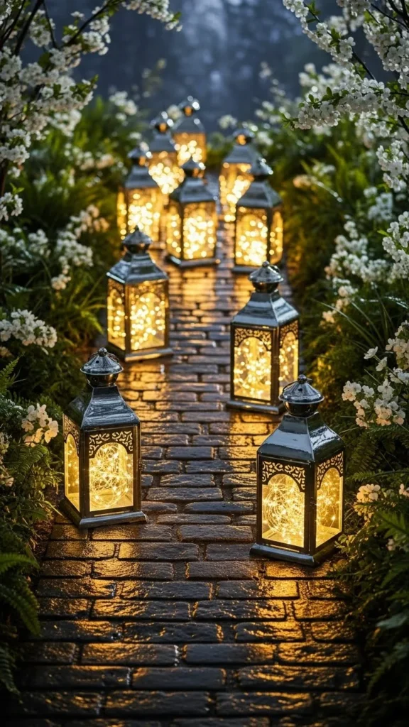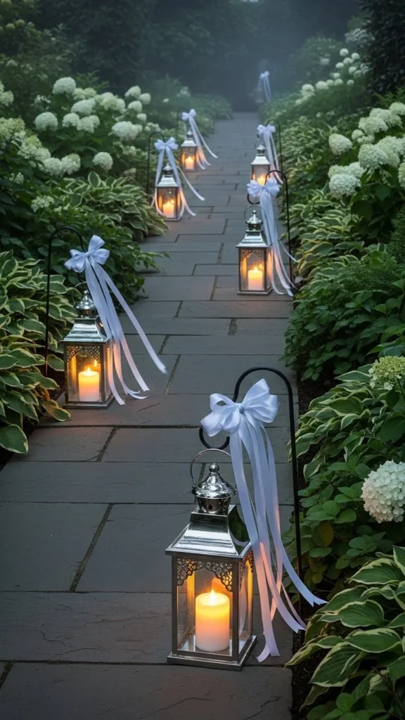Silver ribbon accents on lanterns add a touch of whimsy and elegance to your pathway. These ribbons can be tied around the handles or the body of the lanterns, creating movement and extra shimmer in the light. DIY this idea by purchasing simple silver lanterns and wrapping them with sparkling ribbon. Place them along your pathway, and the light reflecting off the ribbons will create a dazzling effect.