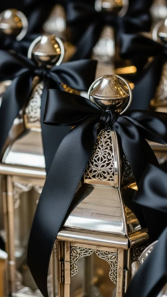 Silver lanterns with black ribbon accents create a dramatic and elegant contrast. The dark ribbons enhance the brightness of the lanterns, making them stand out even more. DIY this look by tying black satin ribbons around the handles of silver lanterns. This style works beautifully for formal or modern New Year celebrations, adding an extra layer of sophistication.
