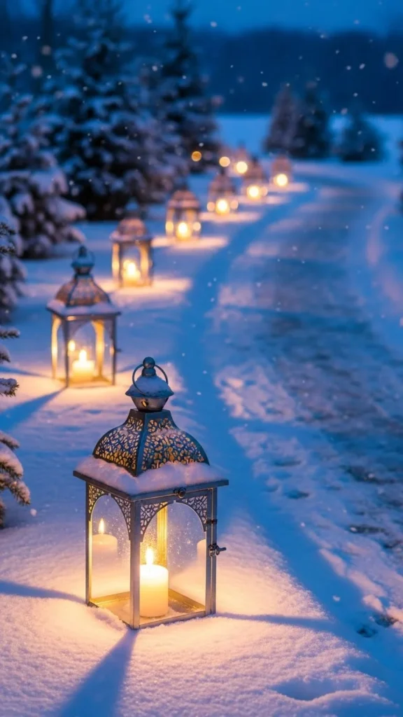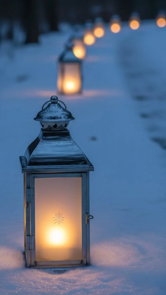 For a winter wonderland vibe, silver lanterns with white snowflake designs are perfect for your New Year celebration. The snowflakes add a festive touch, making your guests feel like they’re stepping into a magical scene. These lanterns can be easily DIY’d by purchasing silver lanterns and painting or stenciling snowflakes on the glass. Add LED candles inside, and your pathway will sparkle with holiday spirit.
