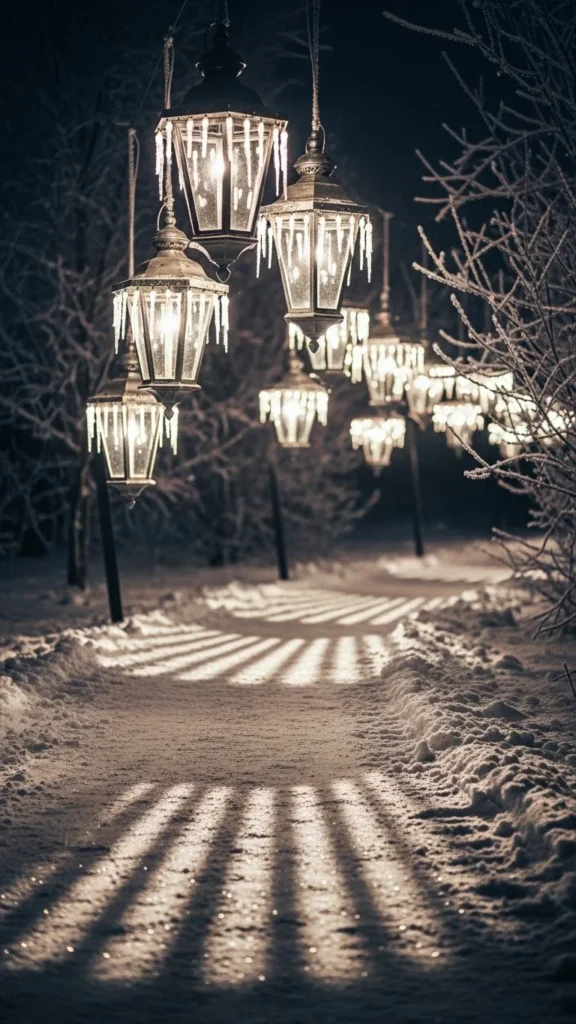 For a sparkling winter touch, silver lanterns with icicle lights create a magical display. The lights hang from the lanterns, twinkling like frozen icicles. DIY this look by attaching icicle string lights to the top of each lantern or purchasing pre-lit lanterns with icicle lights. This will add an enchanting winter effect to your New Year’s pathway.