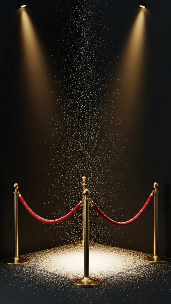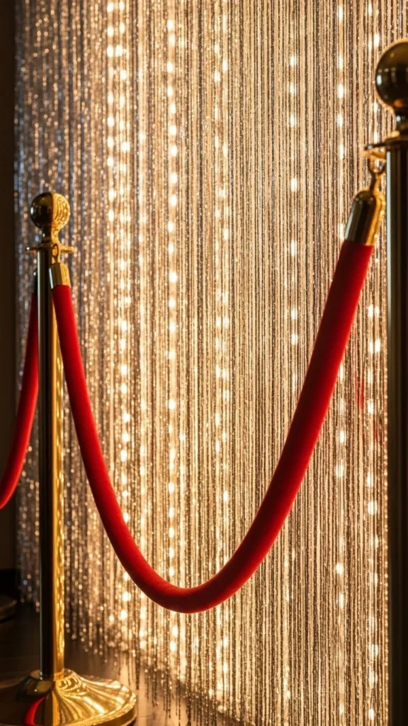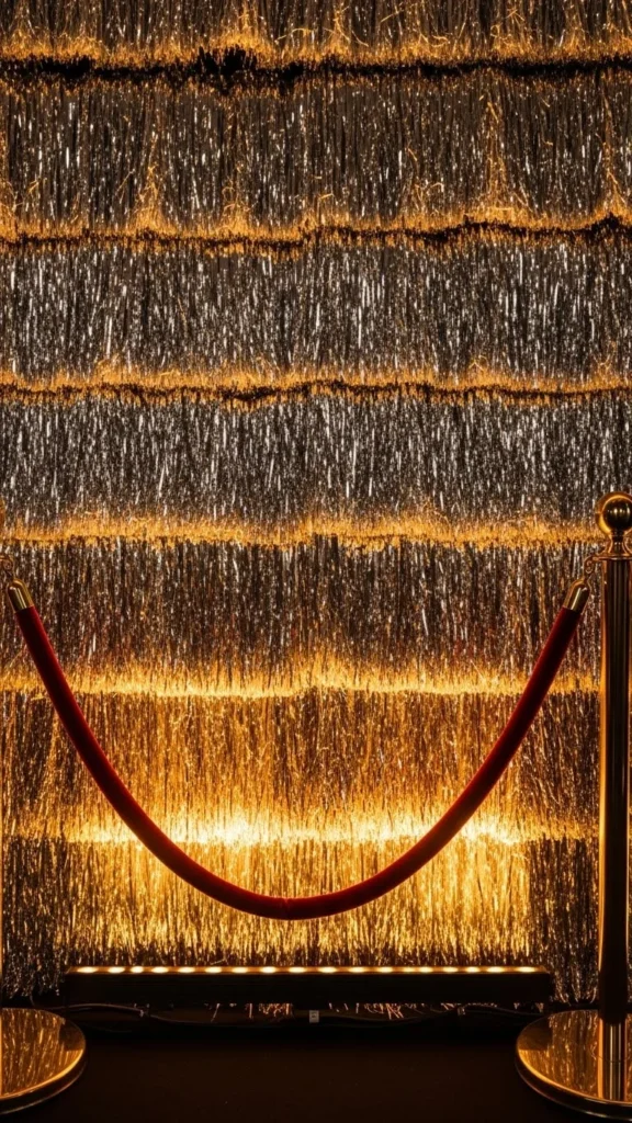 Tinsel curtains are a fast way to create a shiny background. When paired with velvet ropes, the scene feels layered and bold. You can hang two or three curtains behind each other to increase thickness. Choose colors like gold, silver, or champagne. Add a small spotlight to bring out the reflective strands. Place stanchions two feet away so the ropes don’t hide the movement of the tinsel. Budget tip: mix leftover tinsel with new strands for added volume. The ropes add structure and keep guests positioned where the lighting works best.