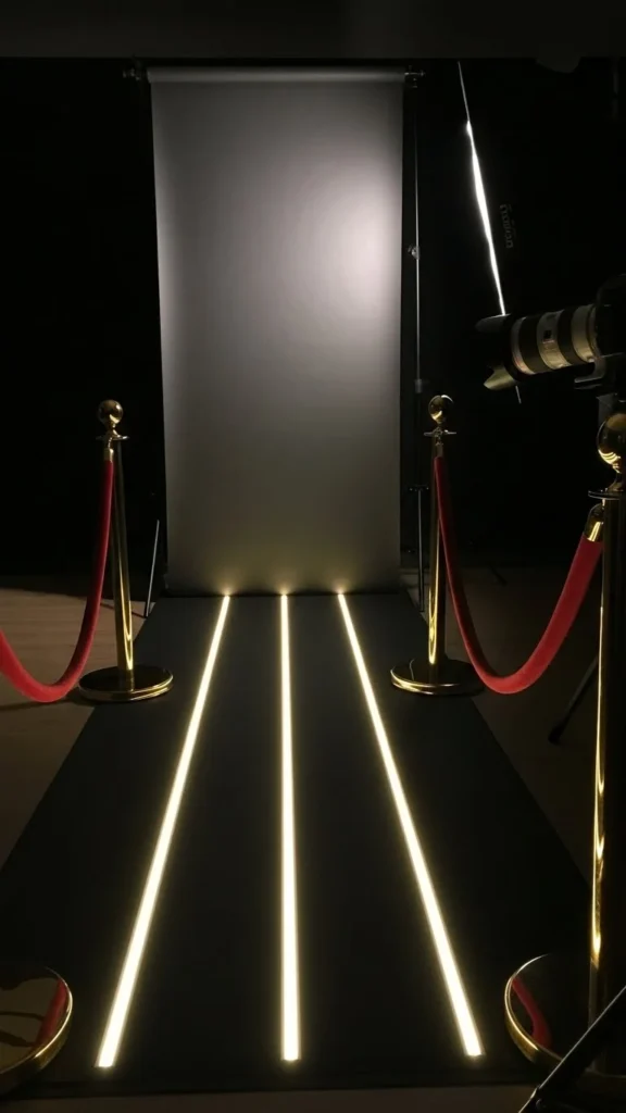 LED floor strips add color and direction. Place the lights under or alongside velvet ropes leading toward the photo area. Choose colors that match your event palette. The light reflects softly on the ropes and creates a dynamic walkway. Use a simple backdrop at the end—fabric, sequins, or props. Budget tip: use LED rope lights instead of strip lights. They cost less and still brighten the walkway. This idea works well in dim spaces where you want clear visual flow toward the photo zone.