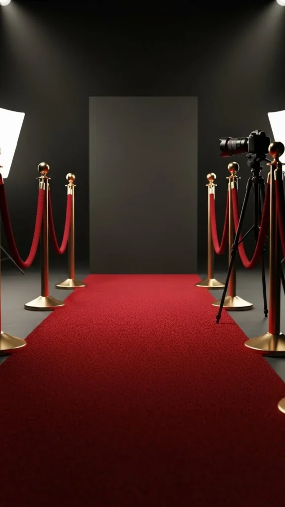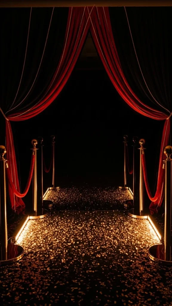A red-carpet runner instantly signals a photo moment. Line both sides with velvet ropes and stanchions. Place your backdrop at the end so guests walk onto the carpet before posing. Add small lights on the floor or at the sides to highlight the carpet texture. Budget option: use red felt instead of carpet. It still gives the right color and tone for pictures. The ropes help maintain a neat walkway and guide the crowd naturally.
