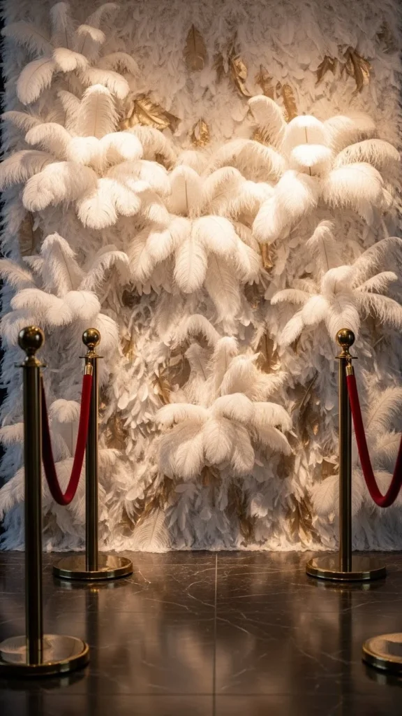 Feather walls feel soft and dramatic. When velvet ropes sit in front, they add structure to the softness. Use faux feathers on a foam board or purchase a pre-made panel. Keep lighting warm so the texture shows clearly. Choose ropes in champagne or black to contrast with the feathers. This setup photographs beautifully, especially in low-light environments. If you want a budget alternative, use feather boas arranged tightly across a fabric panel.