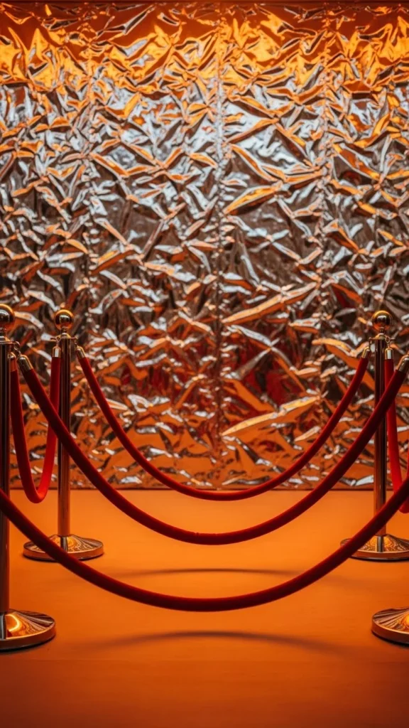 Silver foil walls create distorted reflections that make photos feel energetic. Attach the foil to a smooth surface and let it ripple slightly. Place velvet ropes a foot or two away to create space between guests and the wall. Add colored lights to create depth. Budget tip: use emergency foil blankets for a surprisingly strong reflective effect. The ropes help define the photo zone and keep people positioned at the best distance for flattering pictures.