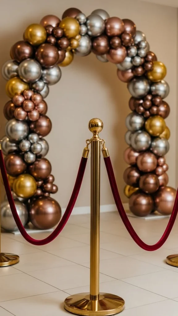 Balloon arches are always fun, but adding velvet ropes turns them into a photo moment with structure. Use ropes to outline the pathway leading toward the arch. This guides guests naturally and makes the backdrop feel intentional. Choose rope colors that match your balloons—burgundy, navy, or black work well with metallic balloons. If you want something budget-friendly, make a DIY balloon garland with small pumps and mixed sizes. Then attach it to a wall or arch frame. Place two stanchions near the front to mark the entry. A small floor spotlight adds dimension to the balloons. This setup is simple, yet it looks impressive in photos. You can also add a reflective mat underneath to catch extra light.