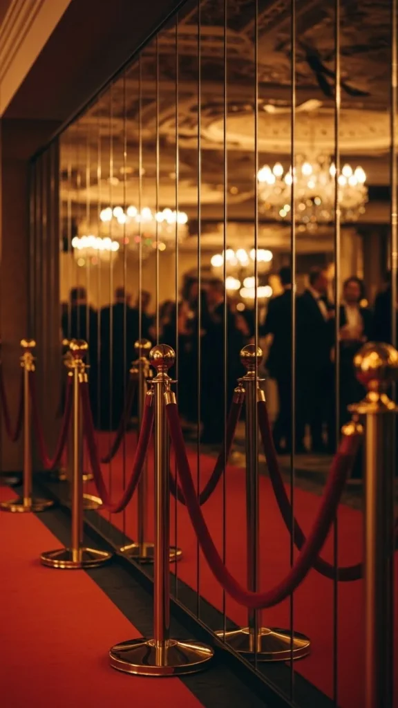Mirror panels are great for adding visual depth. When velvet ropes sit in front of them, the reflections multiply the scene. This makes even small rooms feel larger. Use adhesive mirror tiles or rent mirrored wall pieces if you want a high-impact look. Keep rope colors simple—red or black work best against reflective surfaces. Add uplighting from the sides so light bounces across the panels. Place one decorative prop, such as a disco ball or metallic chair, off to the side for extra interest. If you want a budget version, use mirrored mylar sheets attached to a smooth wall. They reflect enough light to create the effect without heavy hardware. Guests enjoy seeing layered reflections in their photos.