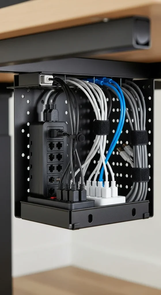 A cable tray keeps wires from hanging under your desk. This simple addition makes your space look cleaner immediately. Choose a metal or plastic tray that attaches under the desk surface. Run your monitor cables, charger, and power strip through the tray. Use small Velcro straps to group related cables together. This prevents tangling and makes future adjustments easy. If your desk doesn’t support drilling, look for clamp-style trays. You can also use adhesive hooks for lighter cables. Once the wires are off the floor, vacuuming becomes easier. A cable tray keeps the area visually clean, which helps your desk feel more inviting each day.