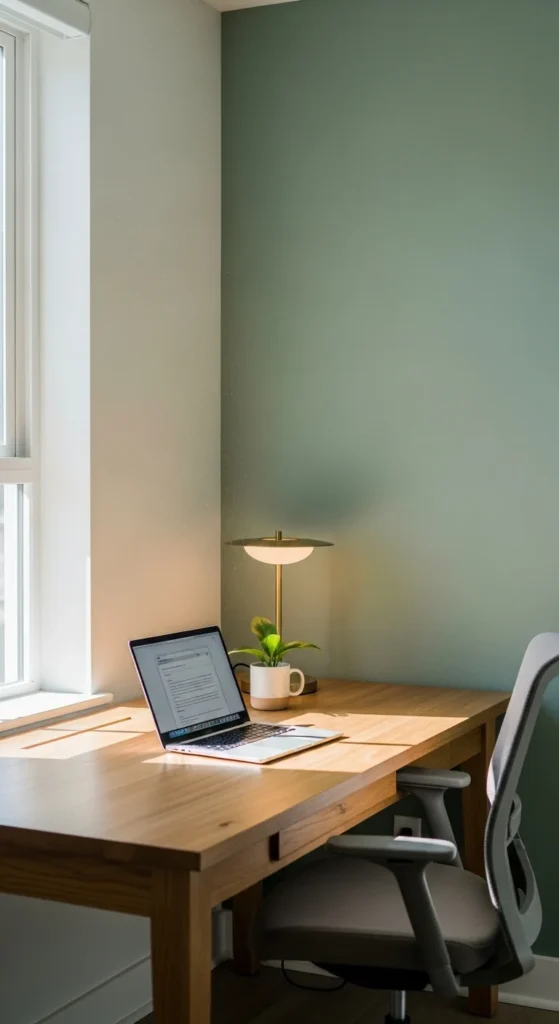 An accent wall adds visual interest without overwhelming the room. Choose a muted tone like sage, soft blue, clay, or charcoal. These colors create depth while staying calm. Paint the wall behind your desk so it frames your workspace. If painting isn’t an option, use removable wallpaper with a subtle pattern. A simple geometric or linen texture works well. If you prefer a handmade touch, paint a large rectangular block behind your desk instead of the full wall. This costs less and still creates impact. Accent walls help define the work area and make the desk feel intentional.