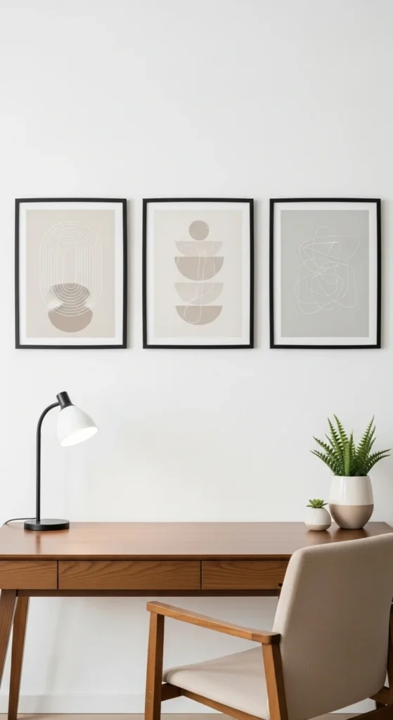 Wall art personalizes your office without creating visual noise. Choose simple prints in calming colors—line drawings, abstract shapes, or nature scenes. A pair or trio of frames works well. Keep the spacing even for a tidy look. If you enjoy DIY touches, print your own designs or frame fabric samples with interesting textures. Use lightweight frames if you’re renting and prefer smaller nails. Art helps break up blank wall space and makes the area feel more intentional. Keep the theme soft and simple so it supports the room instead of distracting you during work.