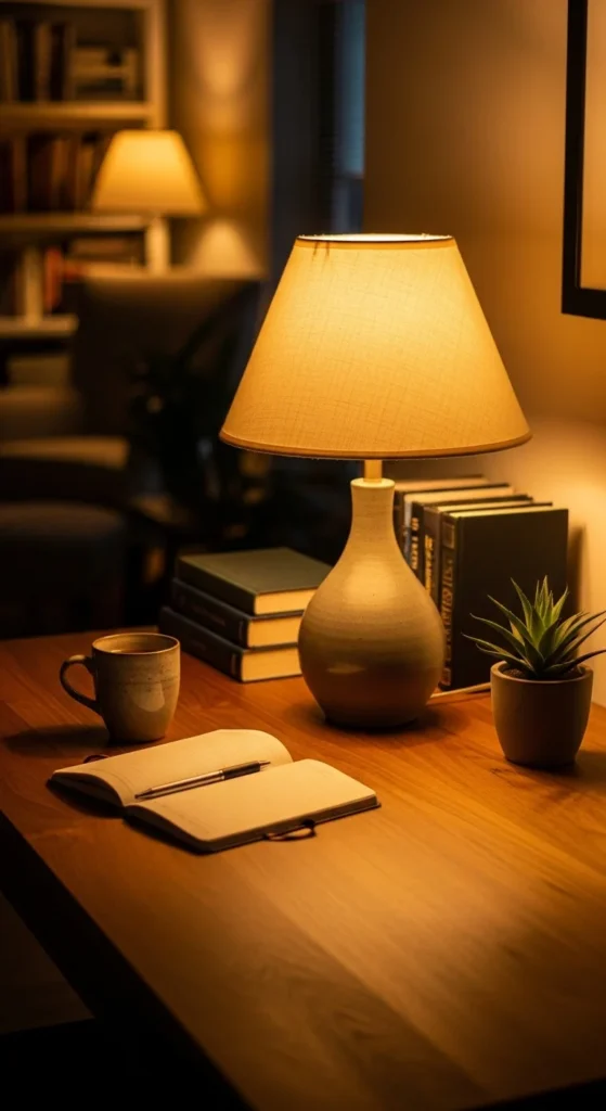 Warm lighting helps create a calmer workspace. Swap harsh white bulbs for soft white or warm LED bulbs that feel pleasant on the eyes. A lamp with a fabric shade spreads light evenly and avoids sharp glare on your screen. If you work late, place a lamp behind your monitor to reduce eye strain. You can also add a low-cost LED strip under a shelf to create a gentle glow. Try placing the lamp on the side opposite your writing hand to reduce shadows when jotting notes. If your room feels too dim, combine one table lamp with a floor lamp to fill the corners of the space. These simple lighting changes cost little but create a friendlier working area. The goal is to create an atmosphere that feels calm without making the room dark. Adjusting one bulb can change the entire mood of your office.
