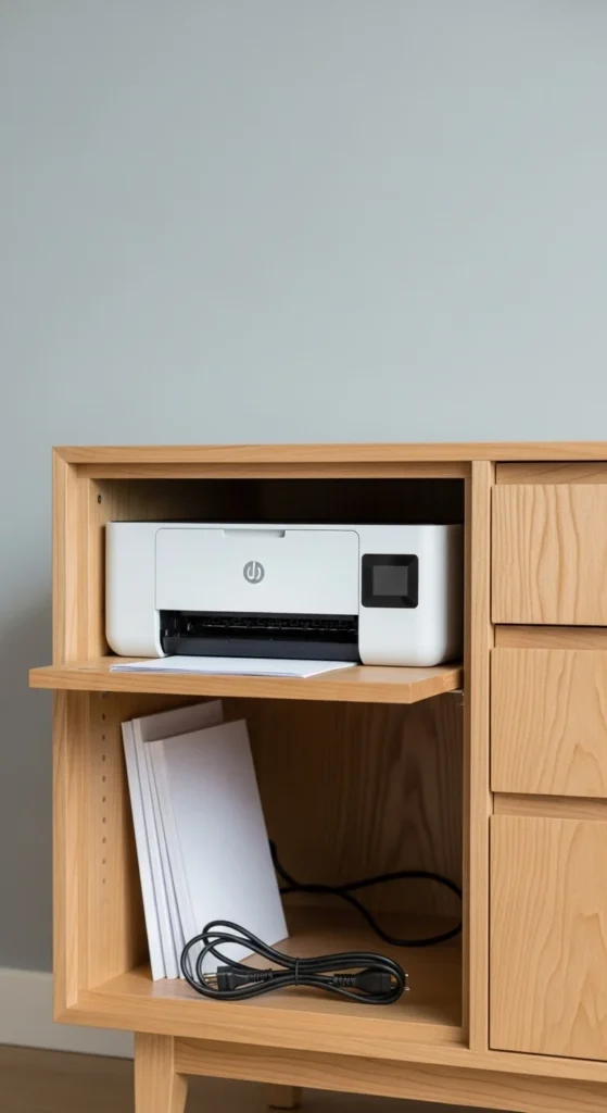 Printers often take up valuable desk space. Moving the printer to a separate corner helps keep your desk clear. Use a lower shelf or a small cabinet to store the printer. Keep paper and ink in a basket nearby. If the printer is wireless, you can place it almost anywhere. Add felt pads under the printer to reduce vibration noise. This setup keeps the main workspace clean and makes the room feel more organized.