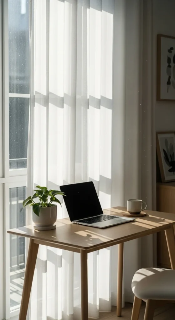 Curtains help control natural light in your workspace. Sheer drapes soften direct sunlight without darkening the room. Choose light colors like white, beige, or cream. If your window faces strong sunlight, pair sheer curtains with thicker side panels. Curtains also add warmth and texture to the room. You can install a tension rod if drilling isn’t allowed. If you enjoy sewing, make DIY curtains using linen or cotton fabric. Curtains help shape the atmosphere and make the workspace feel more inviting.